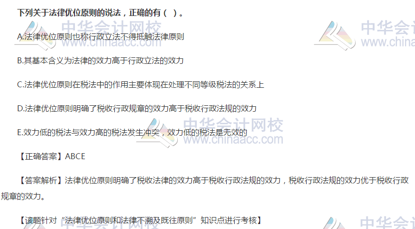 学习离不开看书、做题,做题是关键的一环。尤其是现在距离考试仅剩几十天,大家一定要认真做题!中华会计网校为大家提供精品习题练习,帮助大家更好地备战税务师!以下为2020年税务师考试《税法一》第一章——法律优位原则和法律不溯及既往原则的多选题精选习题。