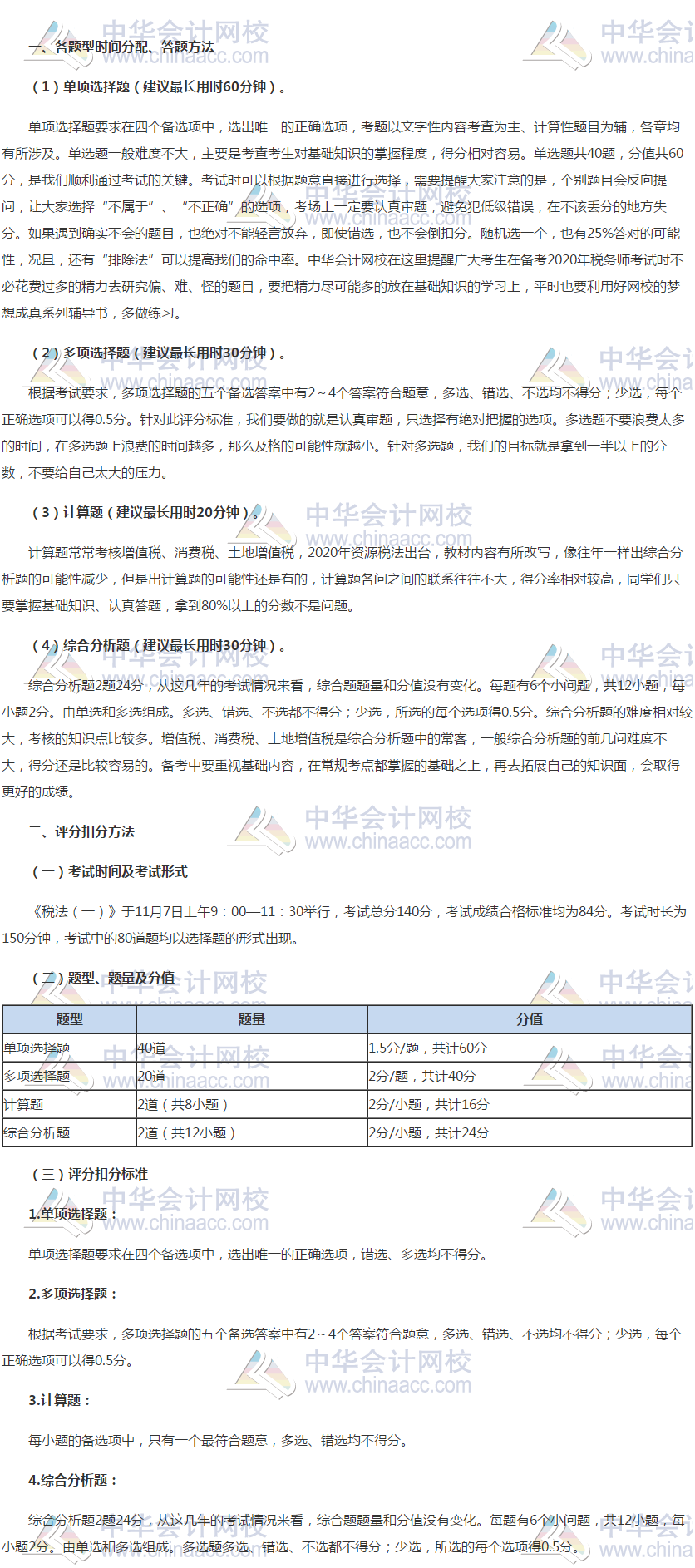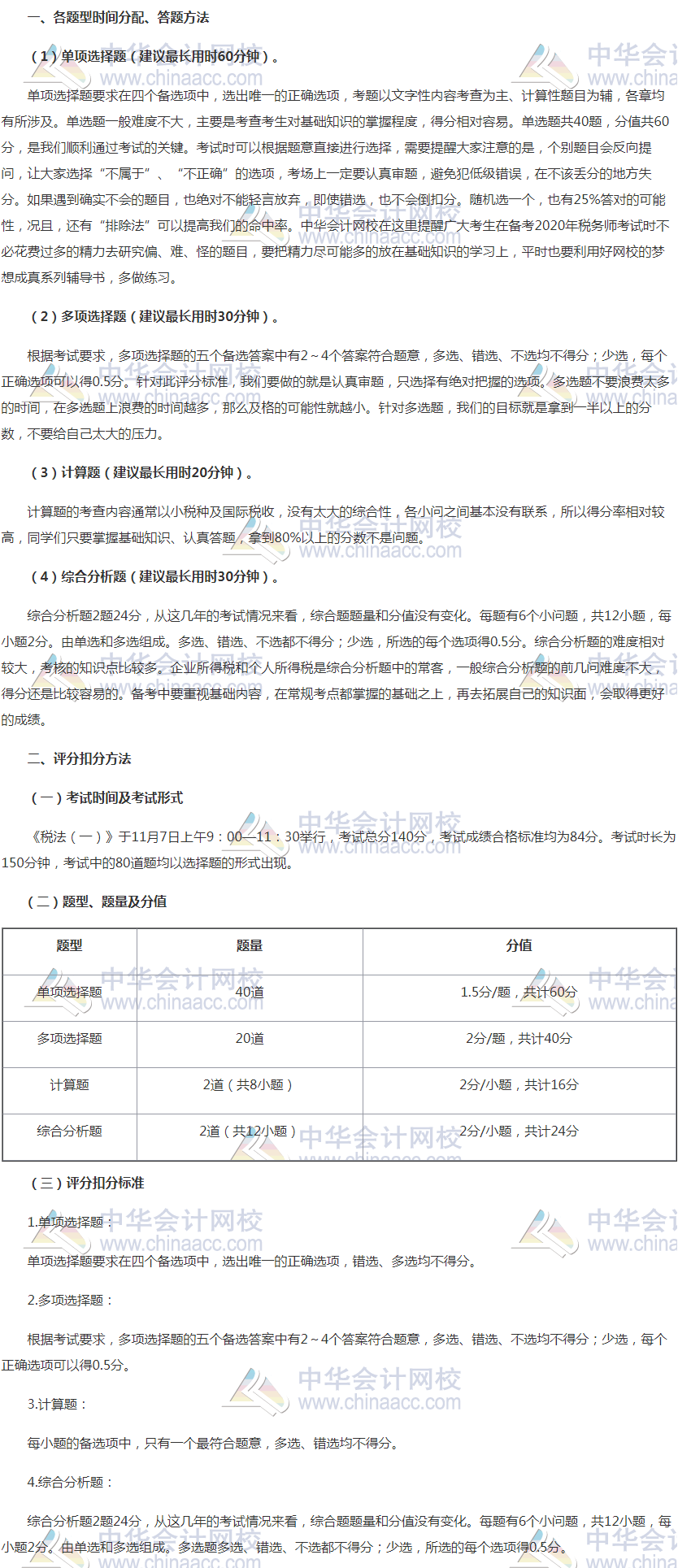 2020年税务师《税法一》各题型时间分配、答题方法、评分扣分标准