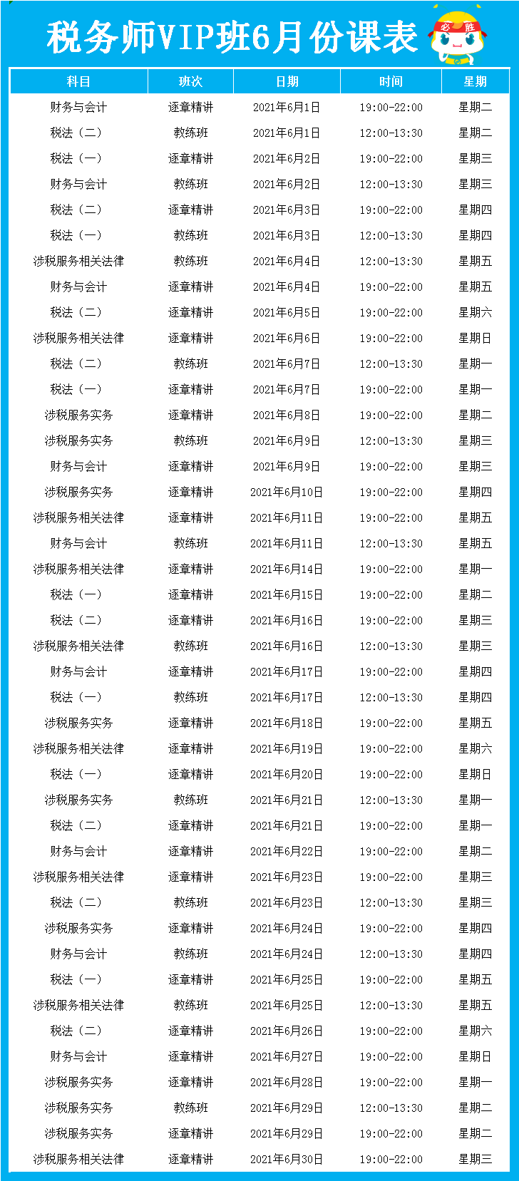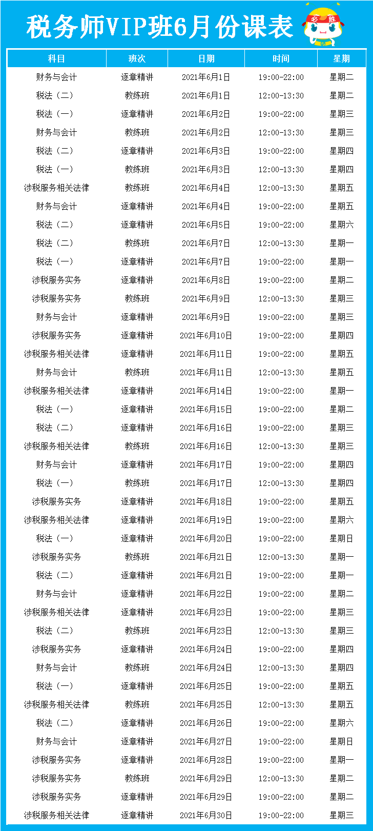 2021税务师VIP签约特训班6月份课表出炉,在VIP班学习的同学请速速查收~根据课程表,按时看课学习哦!提醒大家,千万别偷懒,“班主任”会不定期检查大家的学习进度哦!