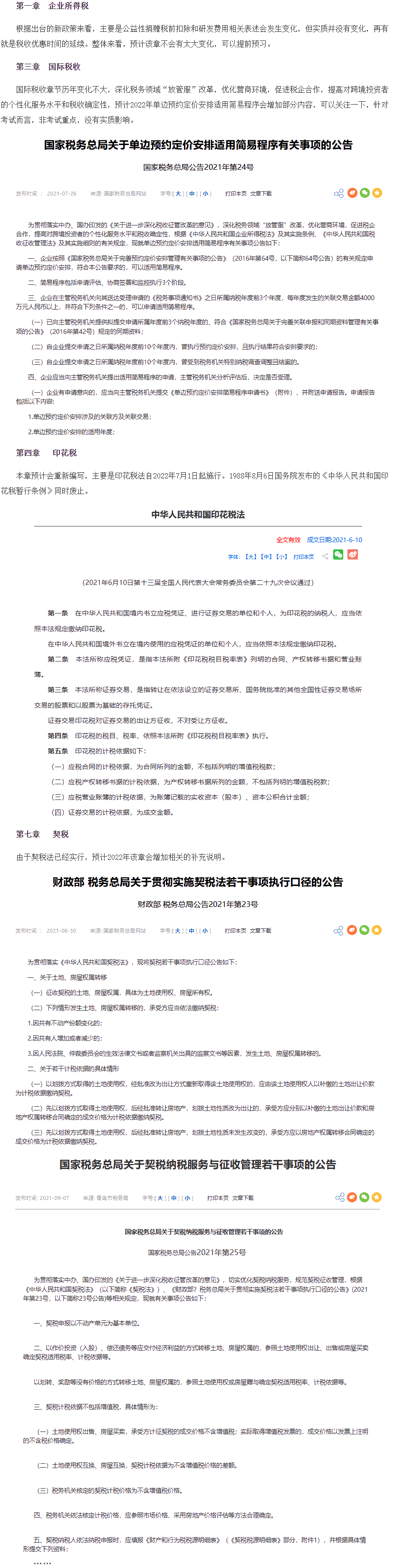 本篇内容是网校根据截至2021年11月底出台的新政策变化给予的教材变动预测参考,预计到2022年税务师教材下发之前还会陆续出台新政策。大家可以根据小编给出的变化做一下参考,提前有所了解。