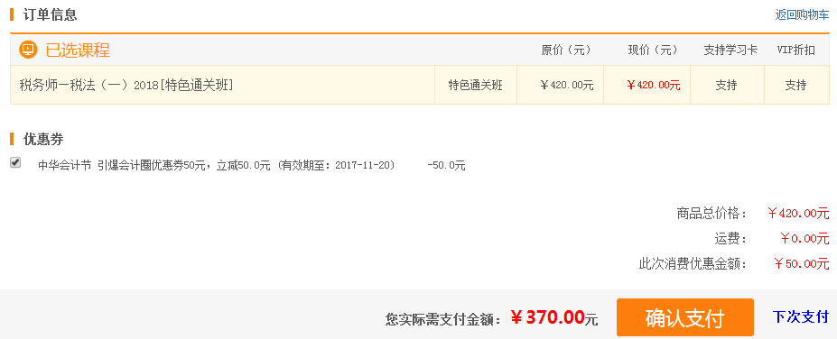 注:以上优惠券可在2017年11月20日24:00前用于购买正保会计网校任意课程、班次升级、转赠好友;每个订单限使用一张优惠券;可与VIP同时享用;继续教育、单班次、教材及辅导书除外。