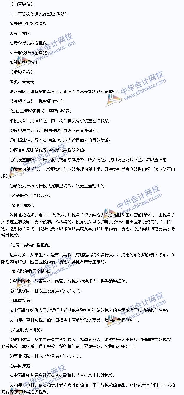我们一起来学习2014《税务代理实务》高频考点:税款征收措施。本考点属于《税务代理实务》第二章税务管理概述第二节税收征收管理程序及要求。
