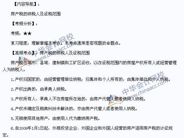 我们一起来学习2014《税务代理实务》高频考点:房产税的纳税人及征税范围。本考点属于《税务代理实务》第十一章其他税种纳税申报和纳税审核第四节房产税、城镇土地使用税纳税审核。