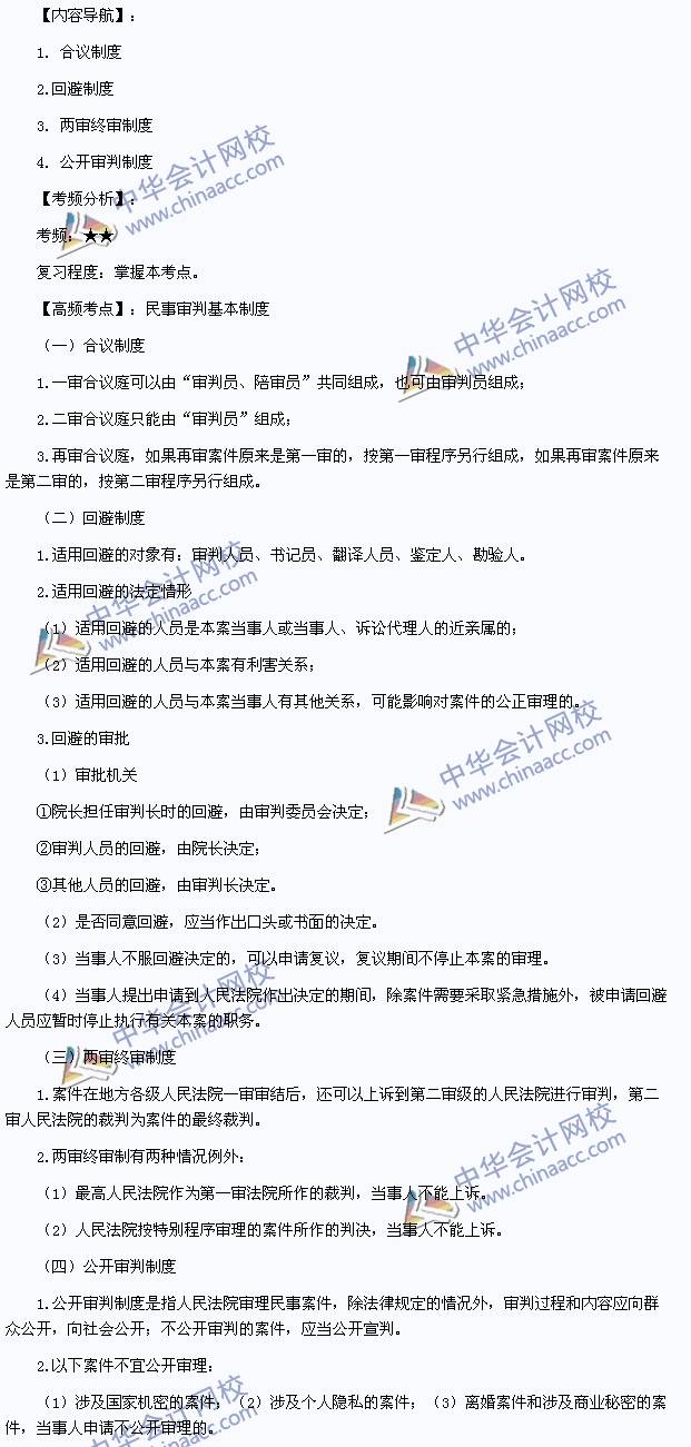 我们一起来学习2014年《税收相关法律》高频考点:民事审判基本制度。本考点属于《税收相关法律》第四篇第二民事诉讼法第一节民事诉讼法概述的内容。