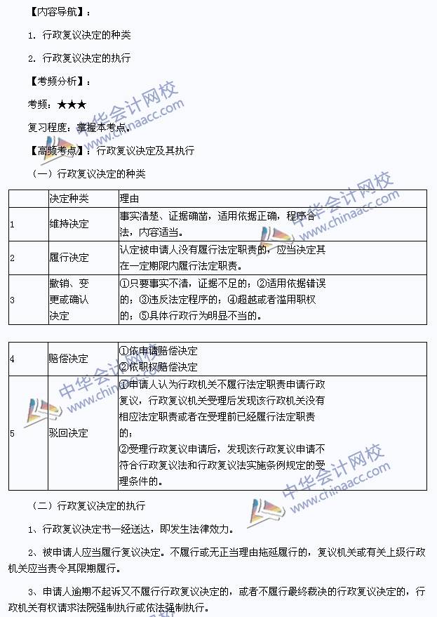 我们一起来学习2014年《税收相关法律》高频考点:行政复议决定及其执行。本考点属于《税收相关法律》第一篇第五章行政复议法律制度第五节行政复议程序的内容。