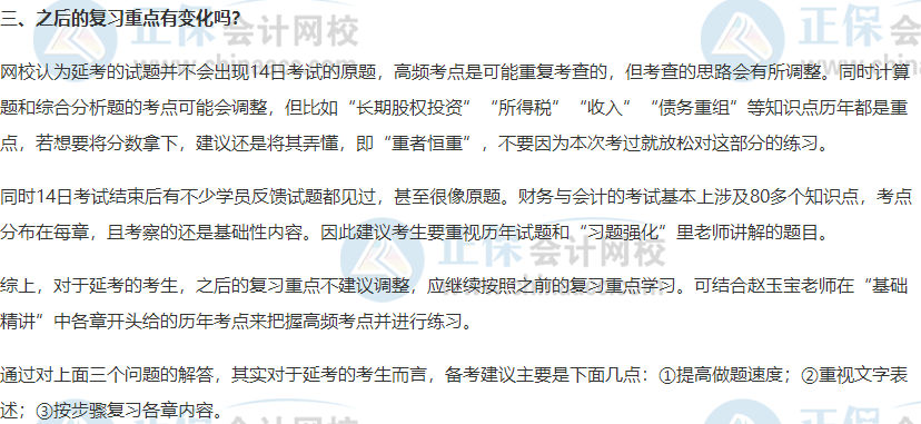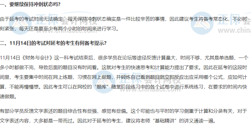 随着11月14日税务师《财务与会计》考试拉下帷幕,部分考生已经结束了本年的备考,不管结果是好是坏,都已成定局。而延考的考生也要继续自己的备考之路了。官方并没有说延考的具体时间,要时刻保持冲刺状态吗?通过这次的考试有什么经验要吸取?之后的复习重点有变化吗?下面一一为大家解答。