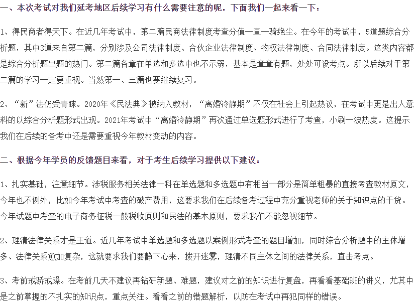 税务师《涉税服务相关法律》2021年未延期的地区考试已经结束,部分考生已经结束了本年的备考,不管结果是好是坏,都已成定局。而延考的考生也要继续自己的备考之路了。官方并没有说延考的具体时间,要时刻保持冲刺状态吗?通过这次的考试有什么经验要吸取?之后的复习重点有变化吗?下面一一为大家解答。