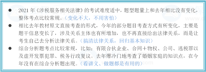 以上信息根据“税务师考后点评+延考指导直播”中的内容进行整理,感兴趣的同学可以去看一看,其中赵俊峰老师讲解的《涉税服务相关法律》部分在100至154分钟。观看直播回放>