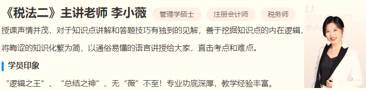 VIP签约特训班《税法二》由李小薇老师主讲,希望同学们能紧跟李小薇老师的脚步,早日拿下税务师证书!