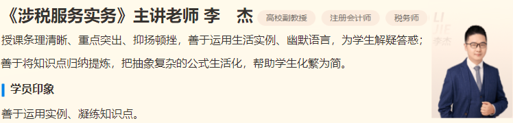 VIP签约特训班《涉税服务实务》由李杰老师主讲,希望同学们能紧跟李杰老师的脚步,早日拿下税务师证书!