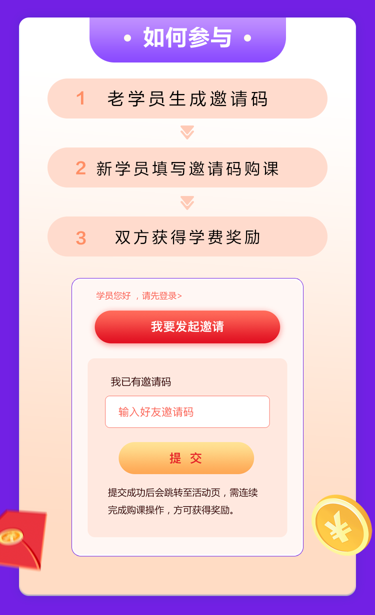 老学员扫码进入活动页面→点击“我要发起邀请”(需登录学员代码)→新同学输入邀请码→提交