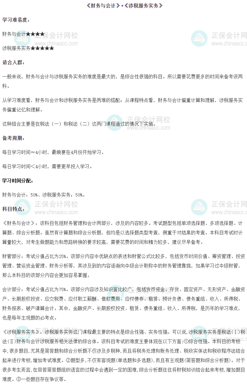税务师考试科目一共有5科,其中《财务与会计》和《涉税服务实务》算是难度较高的两科。但是如果你的计算能力较强,建议把财会和实务放在首年考,这种搭配也适合刚刚考过或正在备战会计职称或注会的同学。