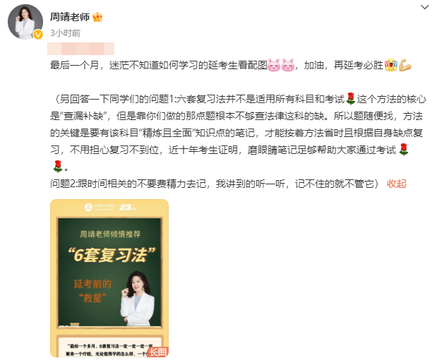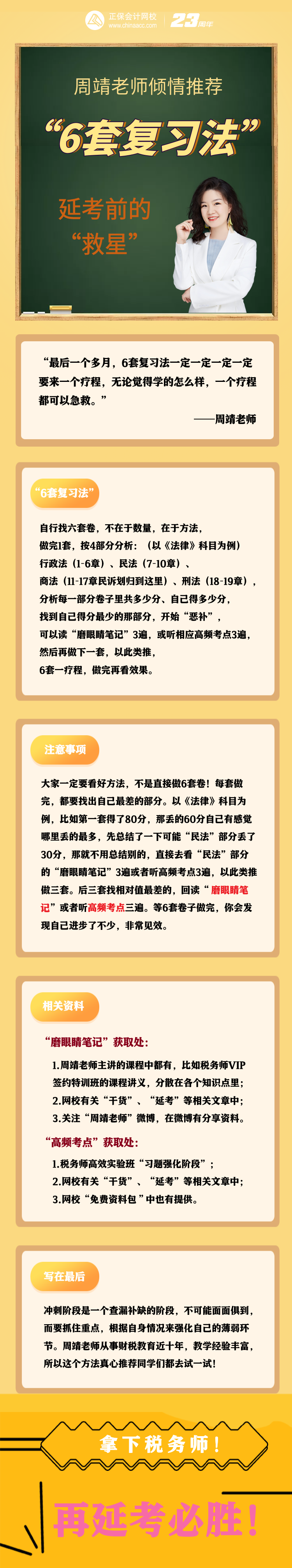 总之还是那句话,“师父领进门、修行在个人”,周靖老师已经将方法传授给我们,至于具体效果怎么样,就要靠自己的努力来达成了!还不了解“6套复习法”的就再来看看,你会有收获的。