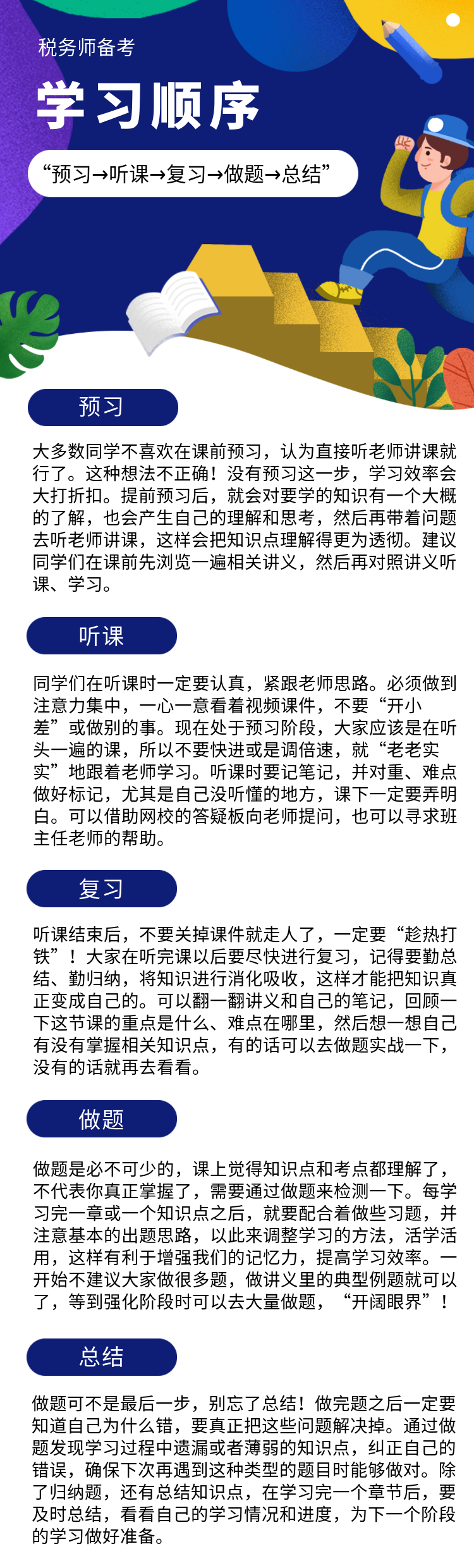 备考税务师,除了学会知识,还有“学会学习”!下面是备考税务师比较推荐的学习顺序,大家可以作为参考,看看能不能运用到自己的备考之中。