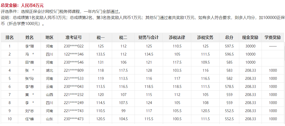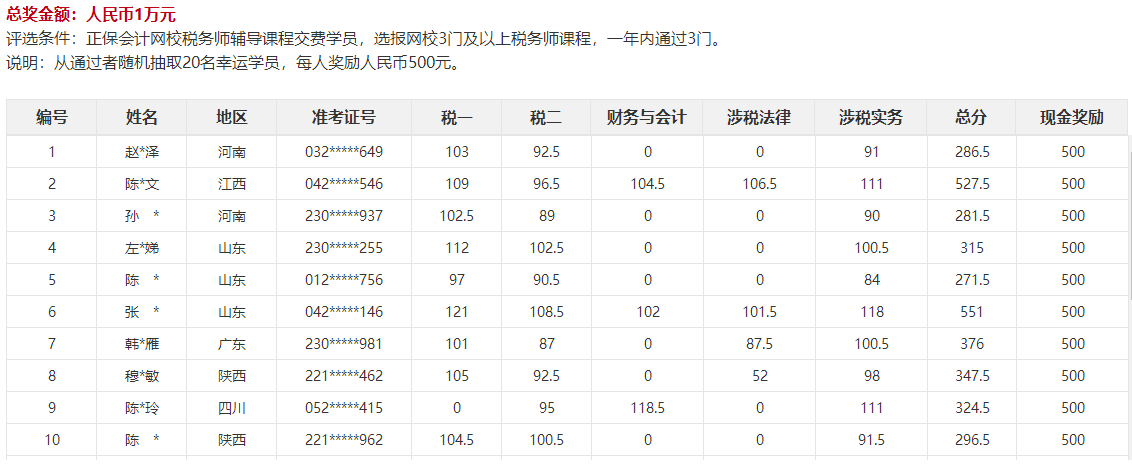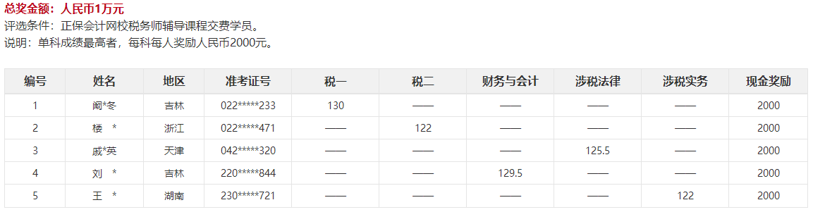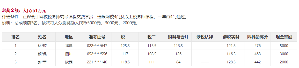 说明:以上部分榜单未展示完全,请移步至“税务师奖学金专题”页面查看完整榜单,前往税务师奖学金专题>>