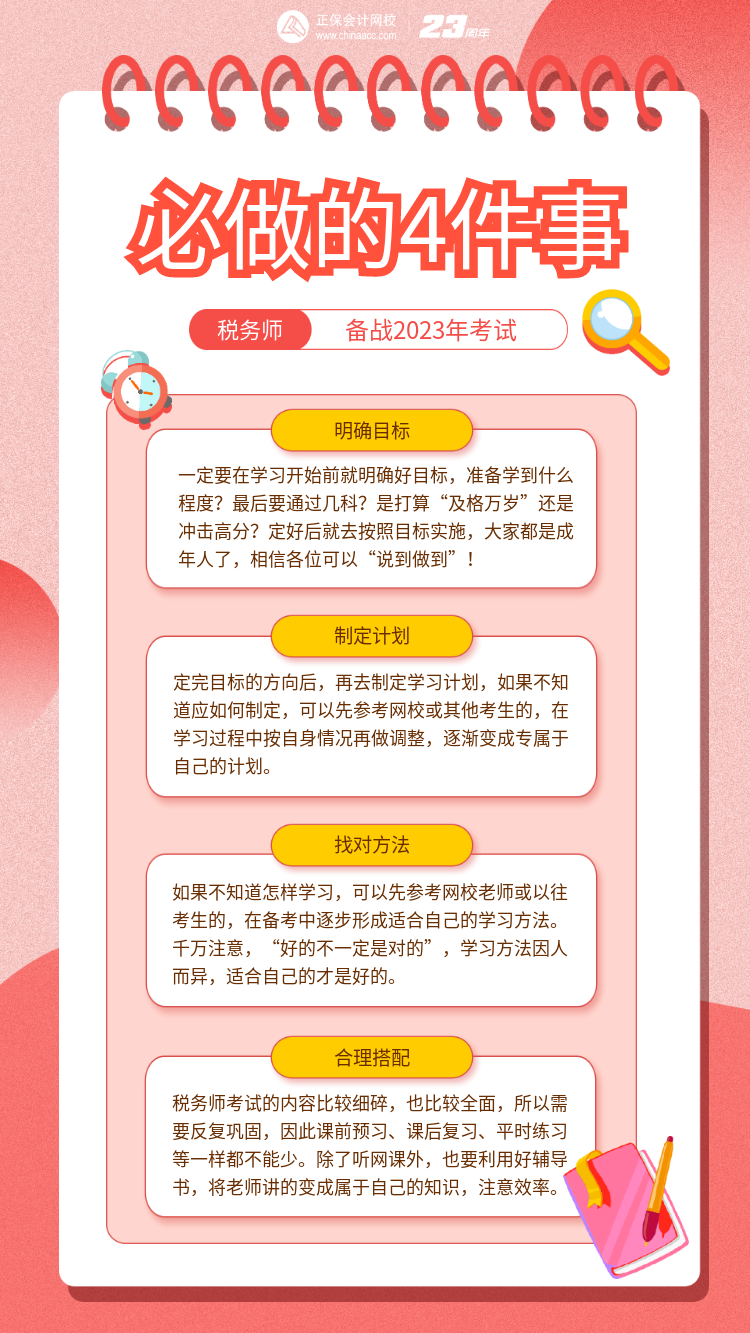 2023年税务师考试将于11月18、19日举行,想参加考试的同学现在要开始复习了!有4件事大家可千万别忘了,备考前、备考时一定要完成!