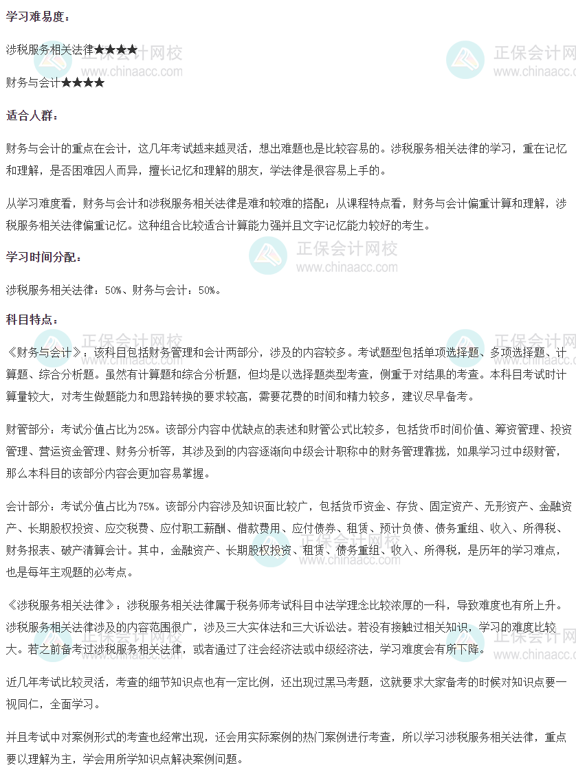 税务师《财务与会计》和《涉税服务相关法律》两科放在一起备考属于难和较难的搭配。从课程特点看,财会偏重计算和理解,法律偏重记忆,这种组合适合计算能力强并且文字记忆能力较好的考生。