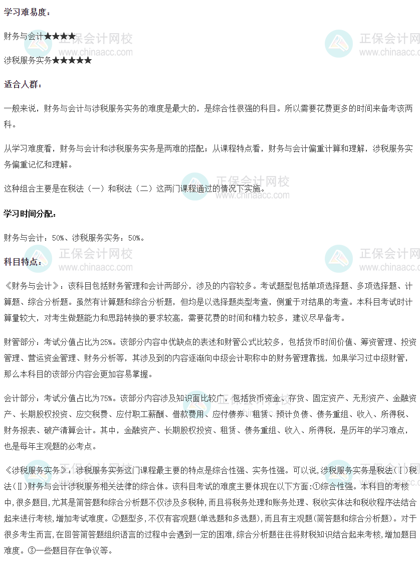《财务与会计》和《涉税服务实务》算是税务师考试中难度较高的两科,但是如果你的计算能力较强,建议把财会和实务放在首年考,这种搭配也适合刚刚考过或正在备战会计职称或注会的同学。