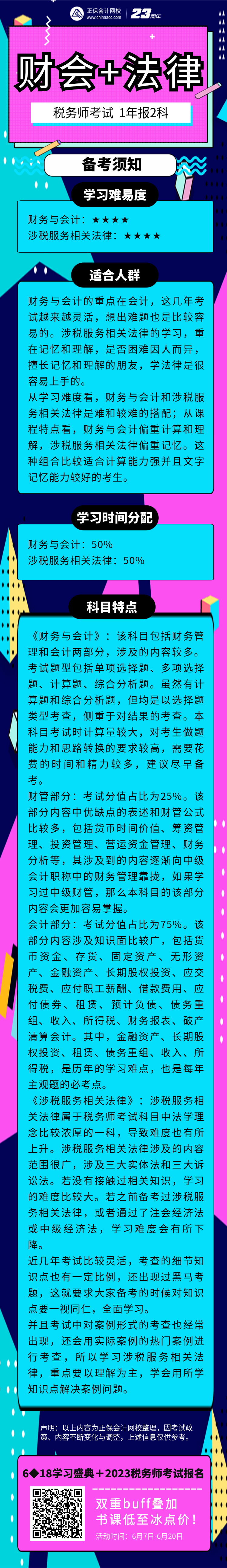 参加税务师考试,通常同学们会选择一年报2-3科,而一年报2科时会选择《财务与会计》和《涉税服务相关法律》,下面就来看看选择财会和法律后应该如何备考吧!