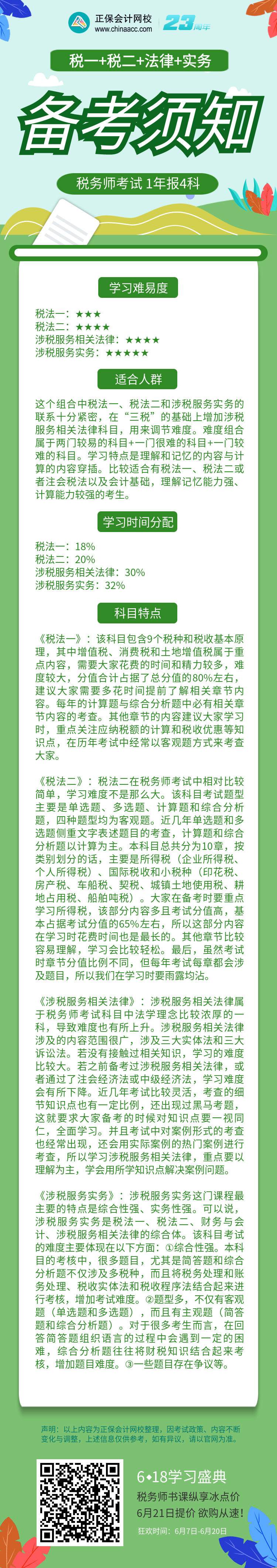 报考税务师,先要考虑考试科目,选择好科目搭配后,就着手开始学习吧!下面为您推荐一种搭配,就是税法一+税法二+涉税服务相关法律+涉税服务实务,这四个科目搭配起来学习难度如何?适合哪些考生?快来看看。