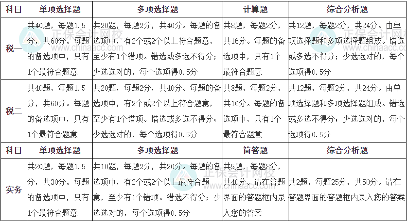 《税法一》《税法二》题型:单项选择题、多项选择题、计算题、综合分析题;