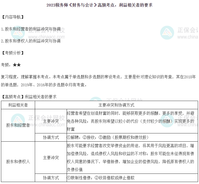 2023年税务师备考正在进行中,网校为各位考生整理了2023年税务师考试《财务与会计》第一章的高频考点——利益相关者的要求,正在复习的同学快来查收!