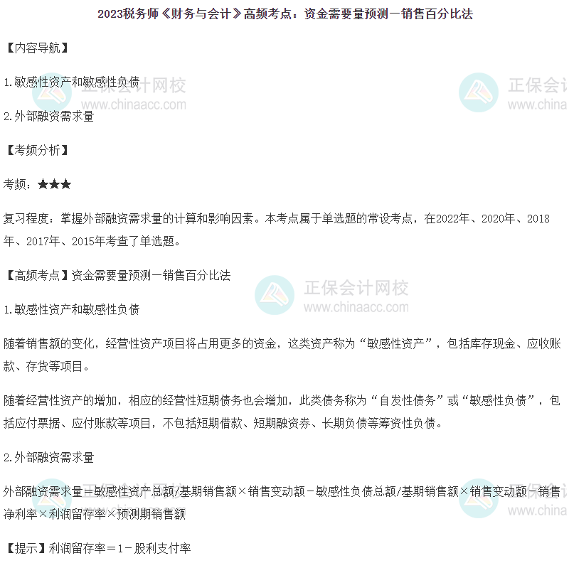 2023年税务师备考正在进行中,网校为各位考生整理了2023年税务师考试《财务与会计》第二章的高频考点——资金需要量预测-销售百分比法,正在复习的同学快来查收!