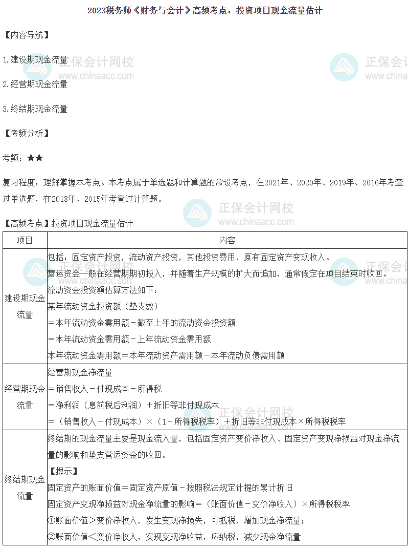 2023年税务师备考正在进行中,网校为各位考生整理了2023年税务师考试《财务与会计》第四章的高频考点——投资项目现金流量估计,正在复习的同学快来查收!