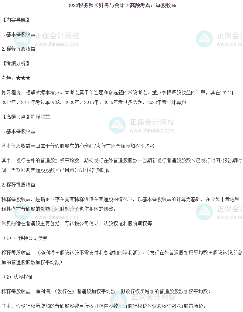 2023年税务师备考正在进行中,网校为各位考生整理了2023年税务师考试《财务与会计》第六章的高频考点——每股收益,正在复习的同学快来查收!