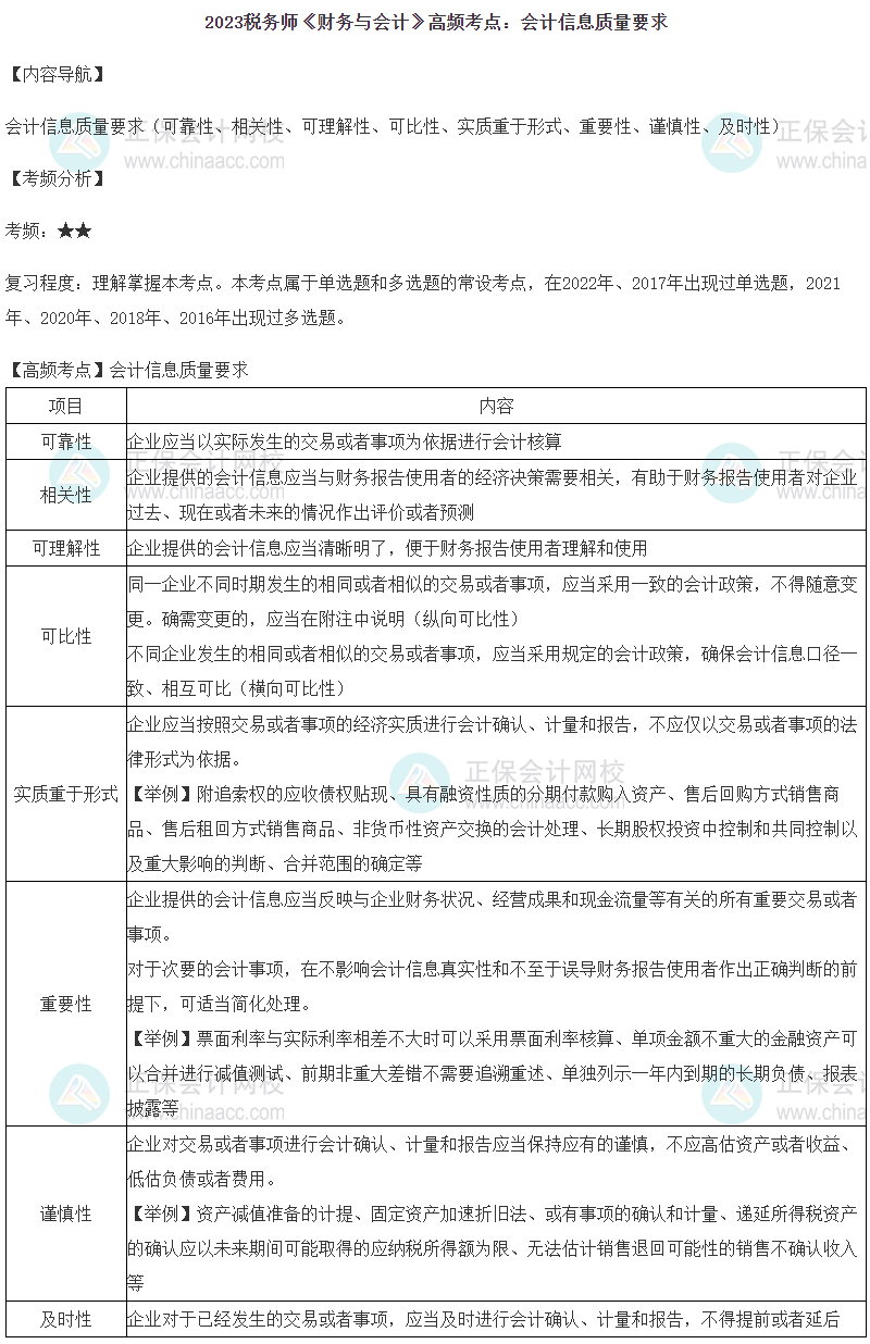 2023年税务师备考正在进行中,网校为各位考生整理了2023年税务师考试《财务与会计》第七章的高频考点——会计信息质量要求,正在复习的同学快来查收!