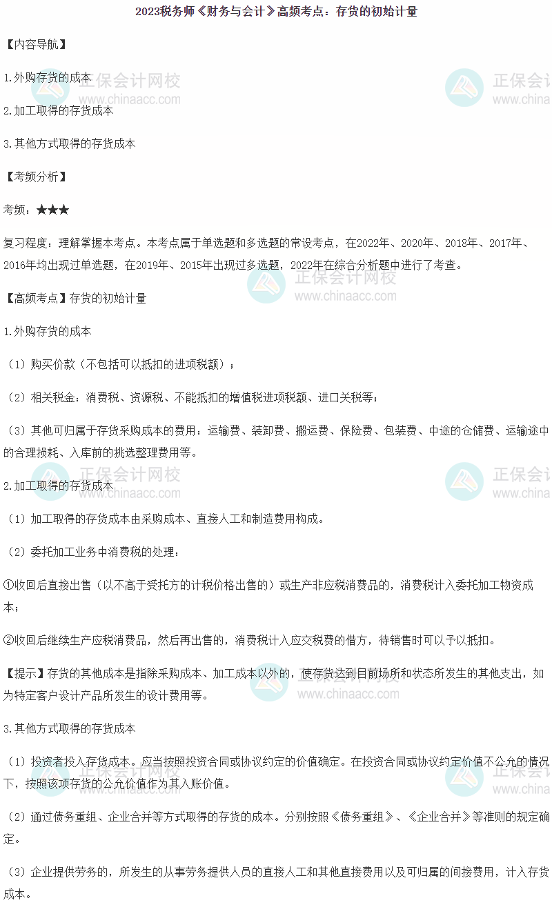 2023年税务师备考正在进行中,网校为各位考生整理了2023年税务师考试《财务与会计》第九章的高频考点——存货的初始计量,正在复习的同学快来查收!