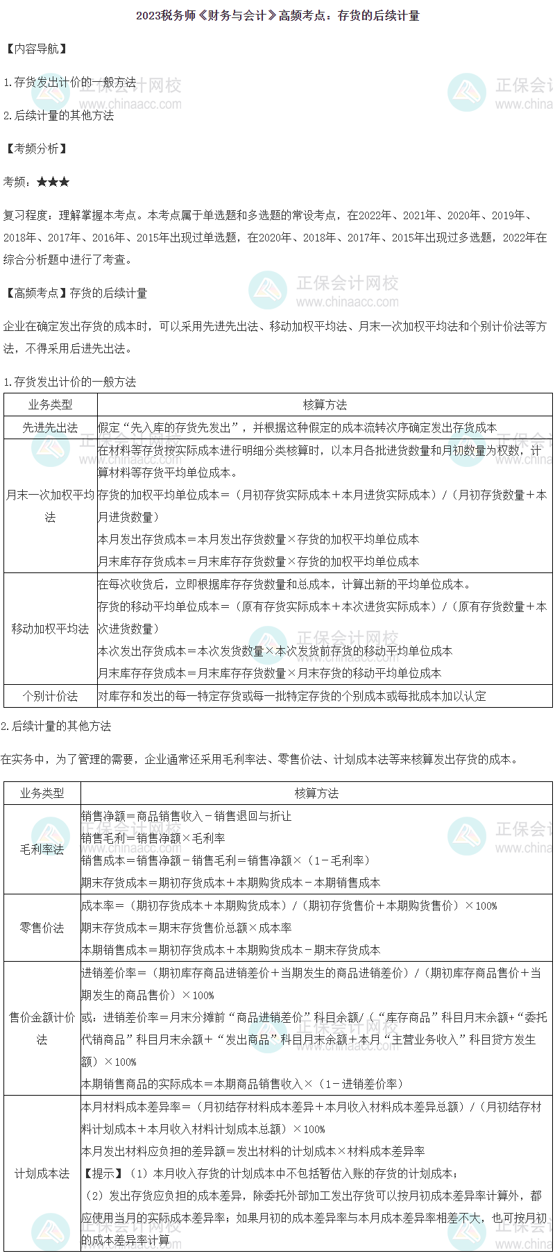 2023年税务师备考正在进行中,网校为各位考生整理了2023年税务师考试《财务与会计》第九章的高频考点——存货的后续计量,正在复习的同学快来查收!