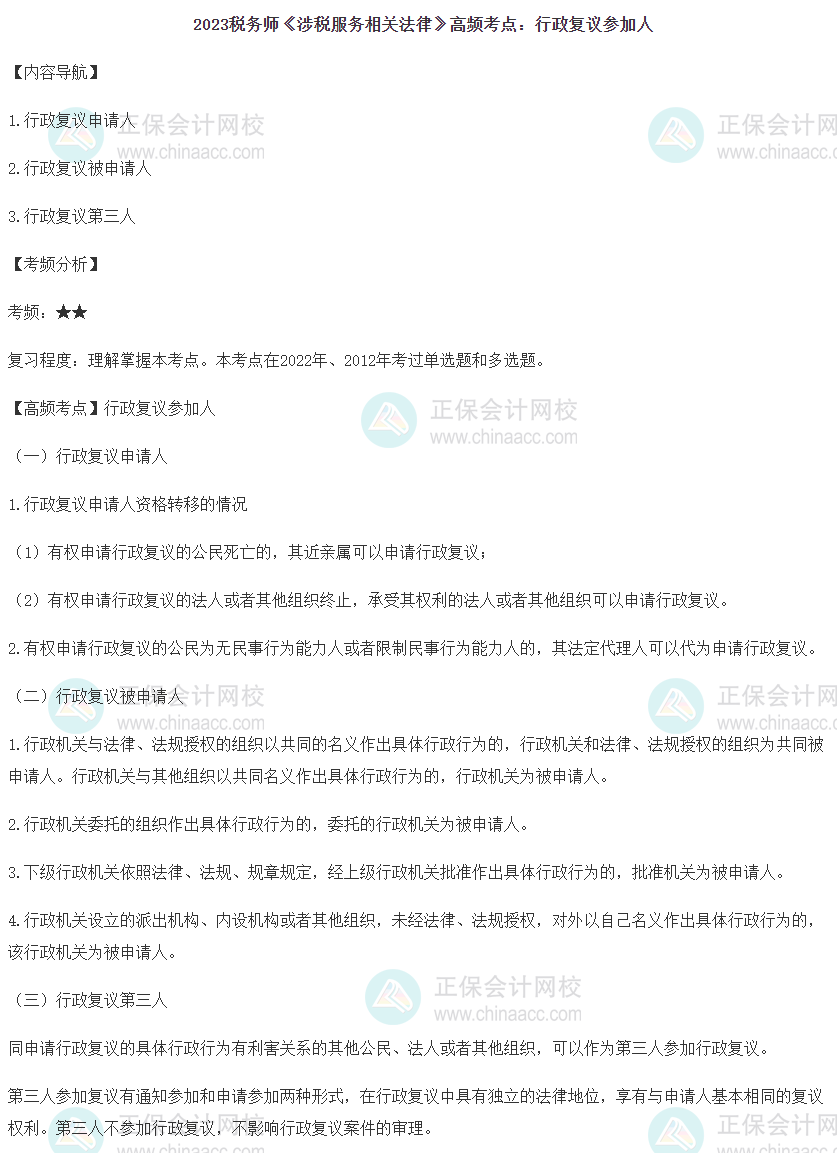 2023年税务师备考正在进行中,网校为各位考生整理了2023年税务师考试《涉税服务相关法律》第五章的高频考点——行政复议参加人,正在复习的同学快来查收!