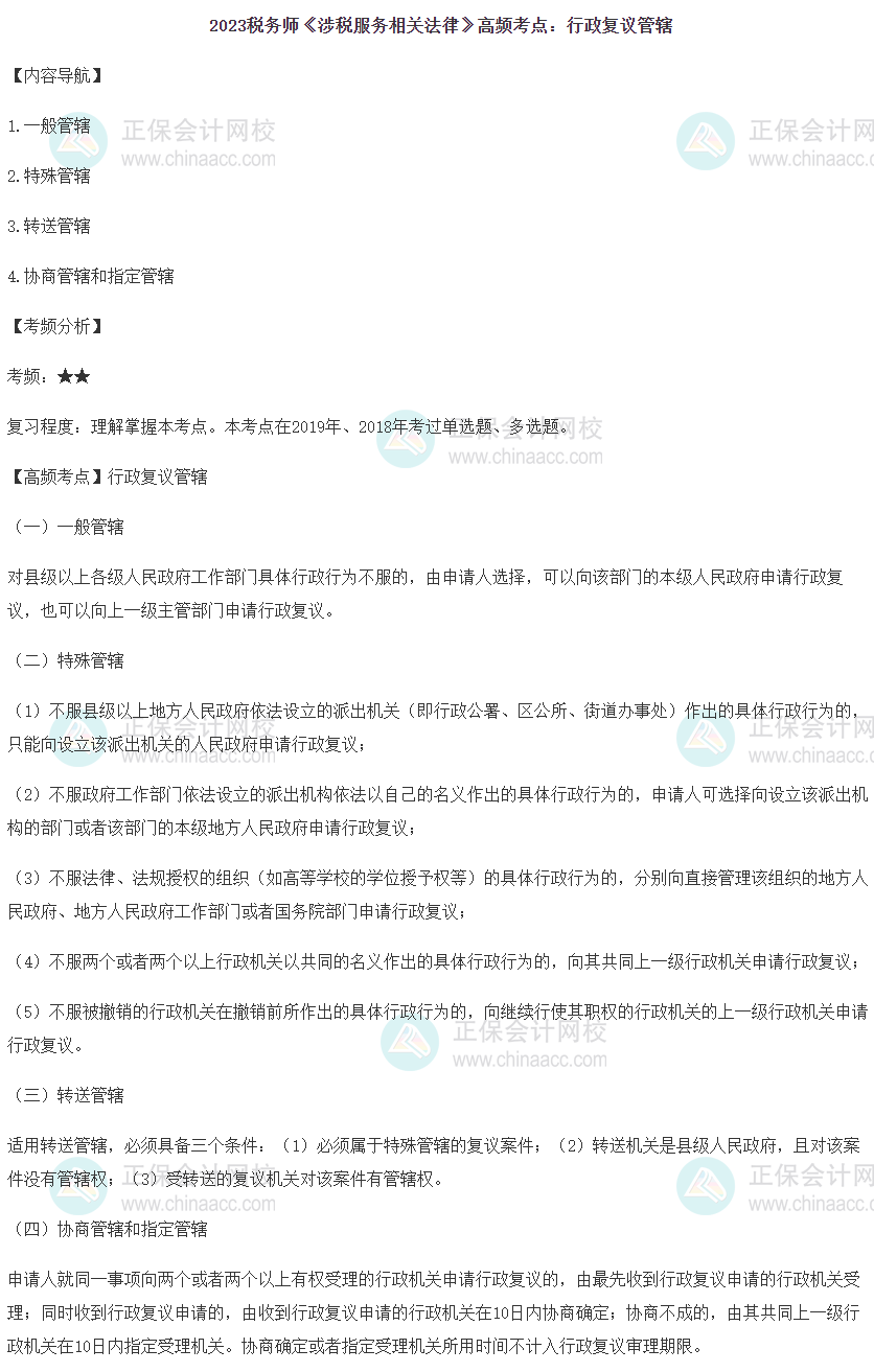 2023年税务师备考正在进行中,网校为各位考生整理了2023年税务师考试《涉税服务相关法律》第五章的高频考点——行政复议管辖,正在复习的同学快来查收!