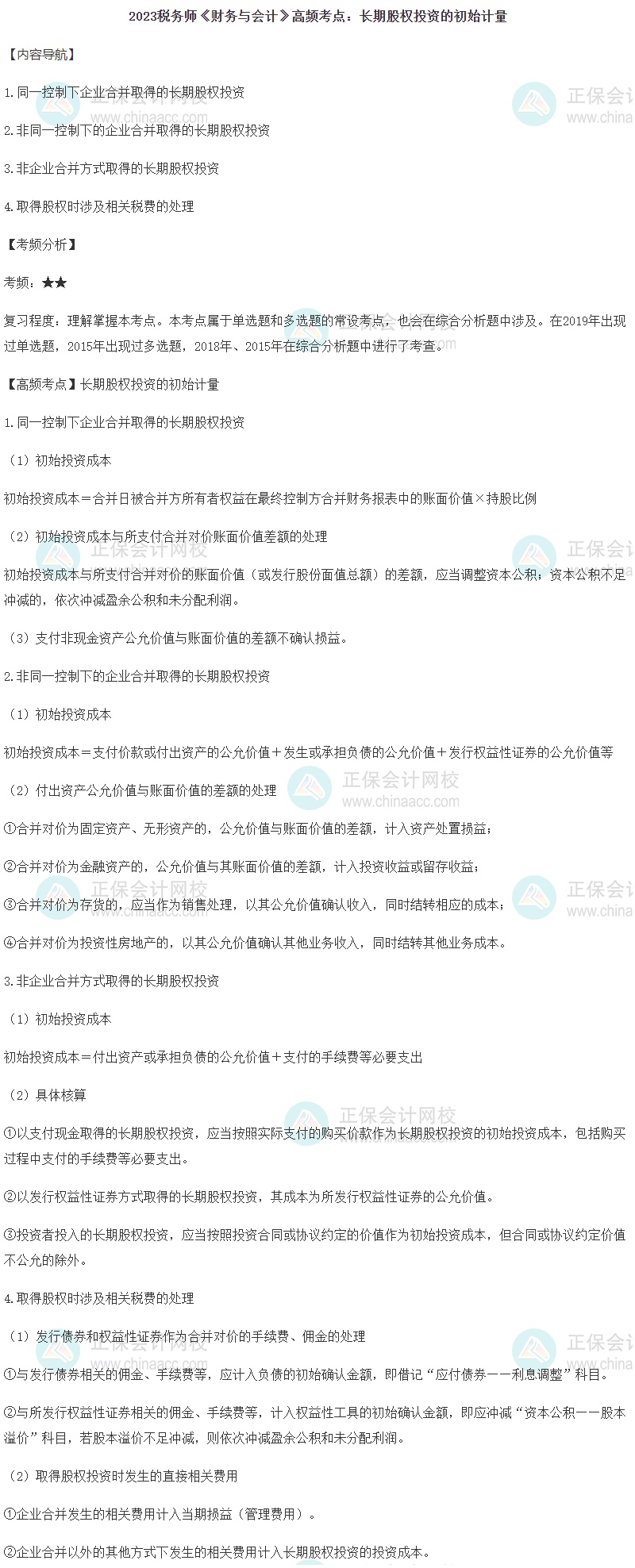 2023年税务师备考正在进行中,网校为各位考生整理了2023年税务师考试《财务与会计》第十一章的高频考点——长期股权投资的初始计量,正在复习的同学快来查收!