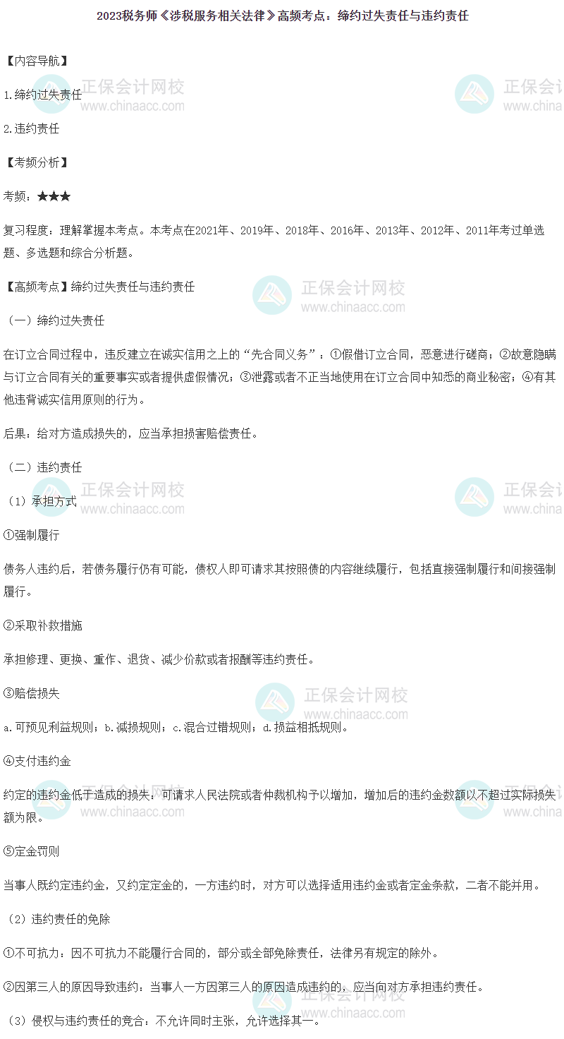 2023年税务师备考正在进行中,网校为各位考生整理了2023年税务师考试《涉税服务相关法律》第九章的高频考点——缔约过失责任与违约责任,正在复习的同学快来查收!