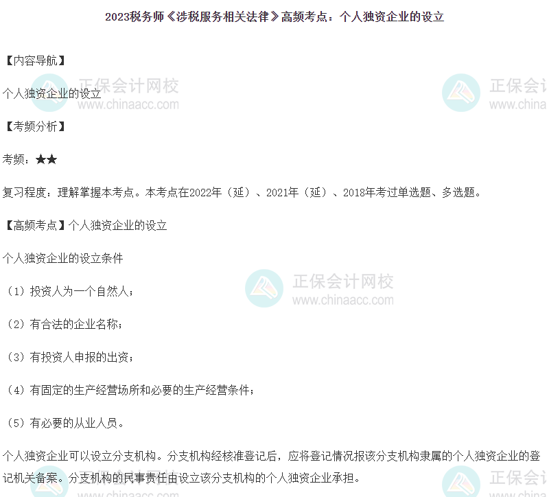2023年税务师备考正在进行中,网校为各位考生整理了2023年税务师考试《涉税服务相关法律》第十一章的高频考点——个人独资企业的设立,正在复习的同学快来查收!