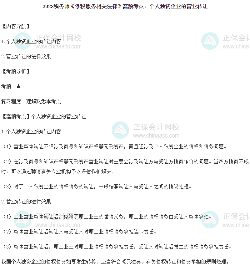 2023年税务师备考正在进行中,网校为各位考生整理了2023年税务师考试《涉税服务相关法律》第十一章的高频考点——个人独资企业的营业转让,正在复习的同学快来查收!
