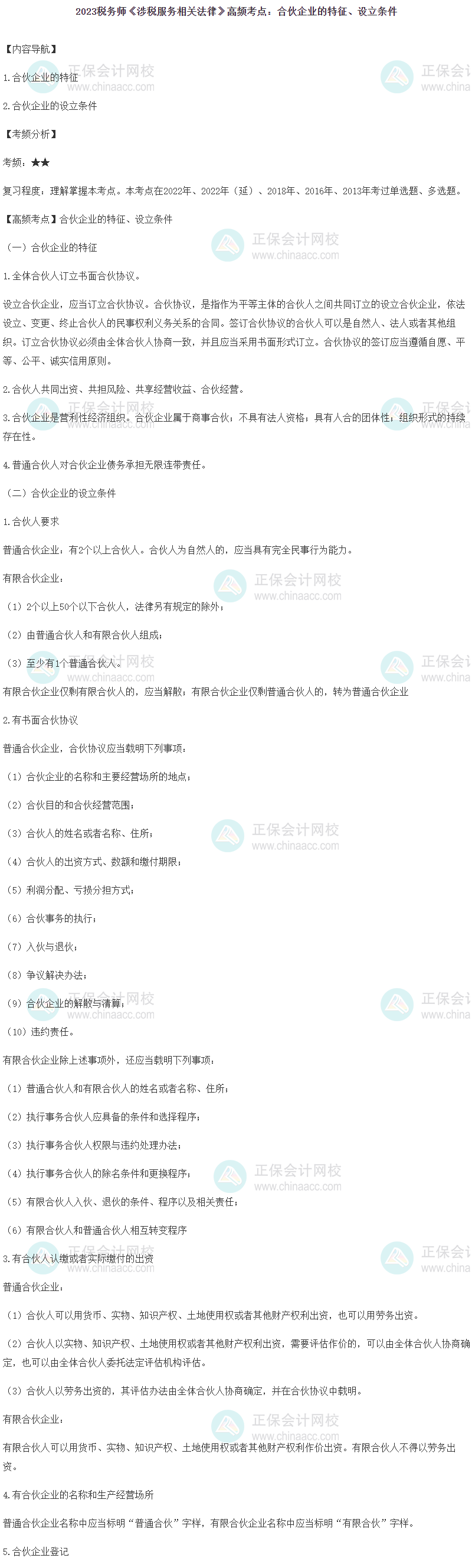 2023年税务师备考正在进行中,网校为各位考生整理了2023年税务师考试《涉税服务相关法律》第十二章的高频考点——合伙企业的特征、设立条件,正在复习的同学快来查收!