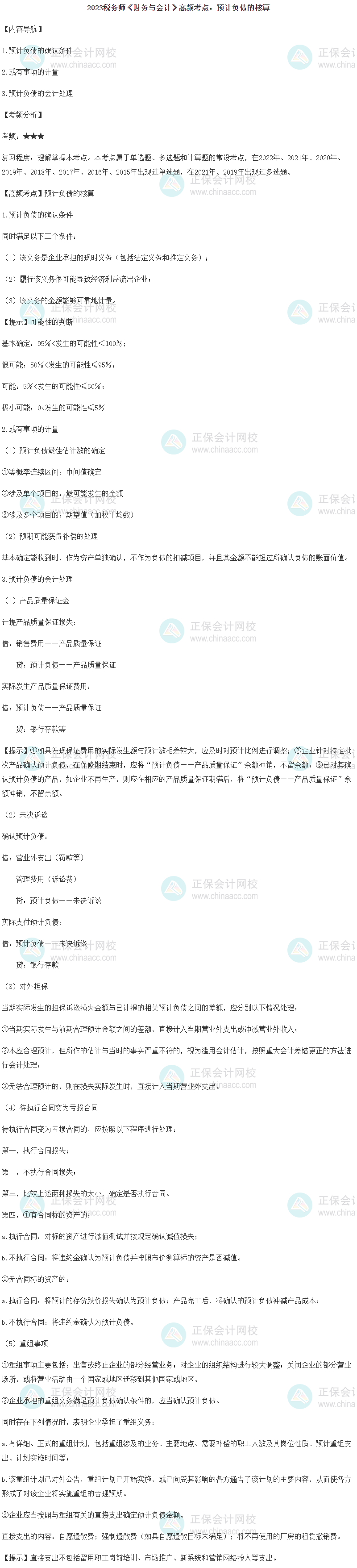 2023年税务师备考正在进行中,网校为各位考生整理了2023年税务师考试《财务与会计》第十三章的高频考点——预计负债的核算,正在复习的同学快来查收!