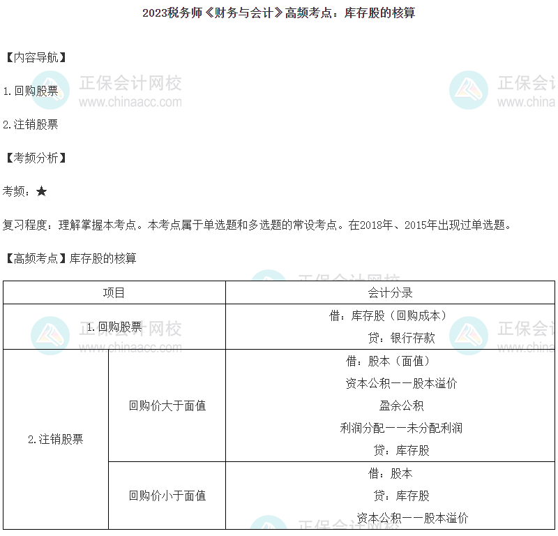 2023年税务师备考正在进行中,网校为各位考生整理了2023年税务师考试《财务与会计》第十四章的高频考点——库存股的核算,正在复习的同学快来查收!
