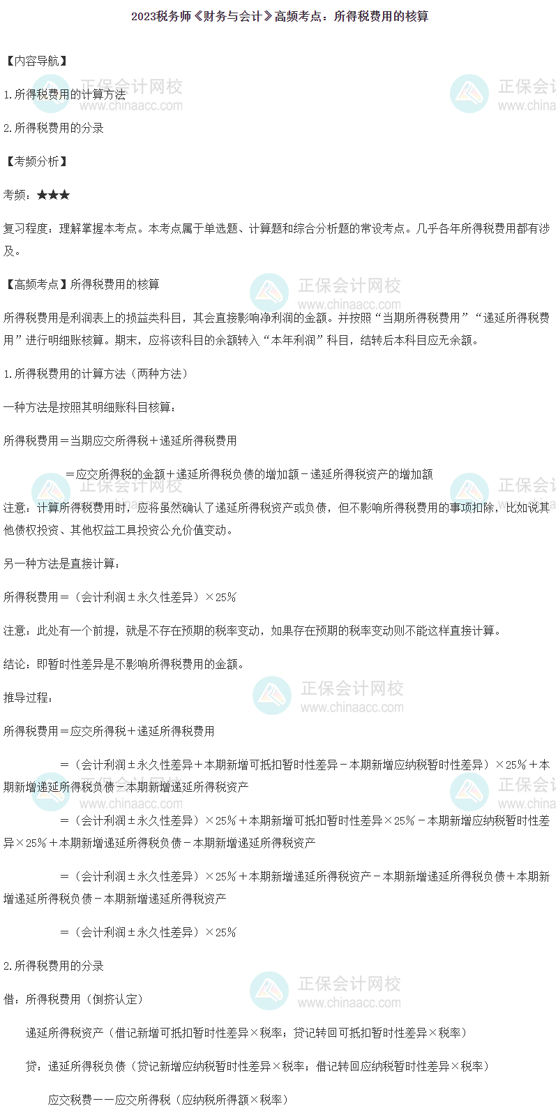 2023年税务师备考正在进行中,网校为各位考生整理了2023年税务师考试《财务与会计》第十六章的高频考点——所得税费用的核算,正在复习的同学快来查收!