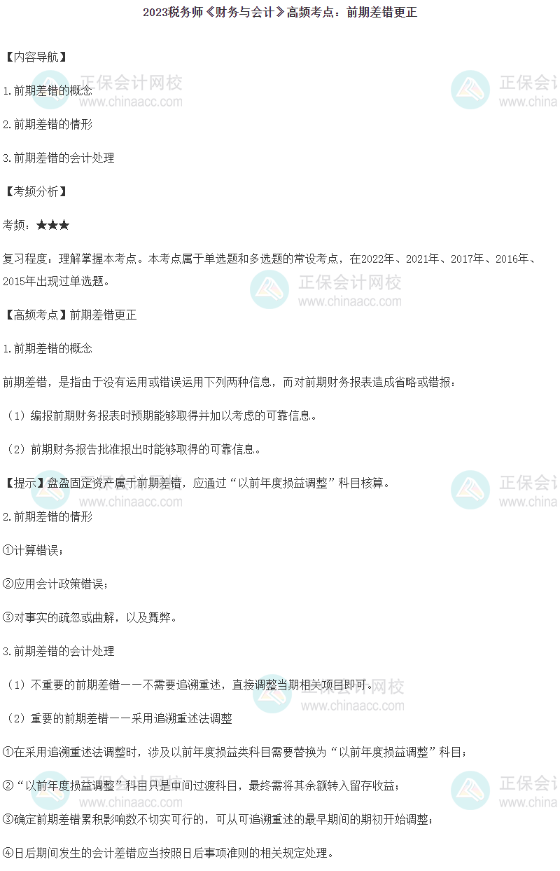 2023年税务师备考正在进行中,网校为各位考生整理了2023年税务师考试《财务与会计》第十七章的高频考点——前期差错更正,正在复习的同学快来查收!