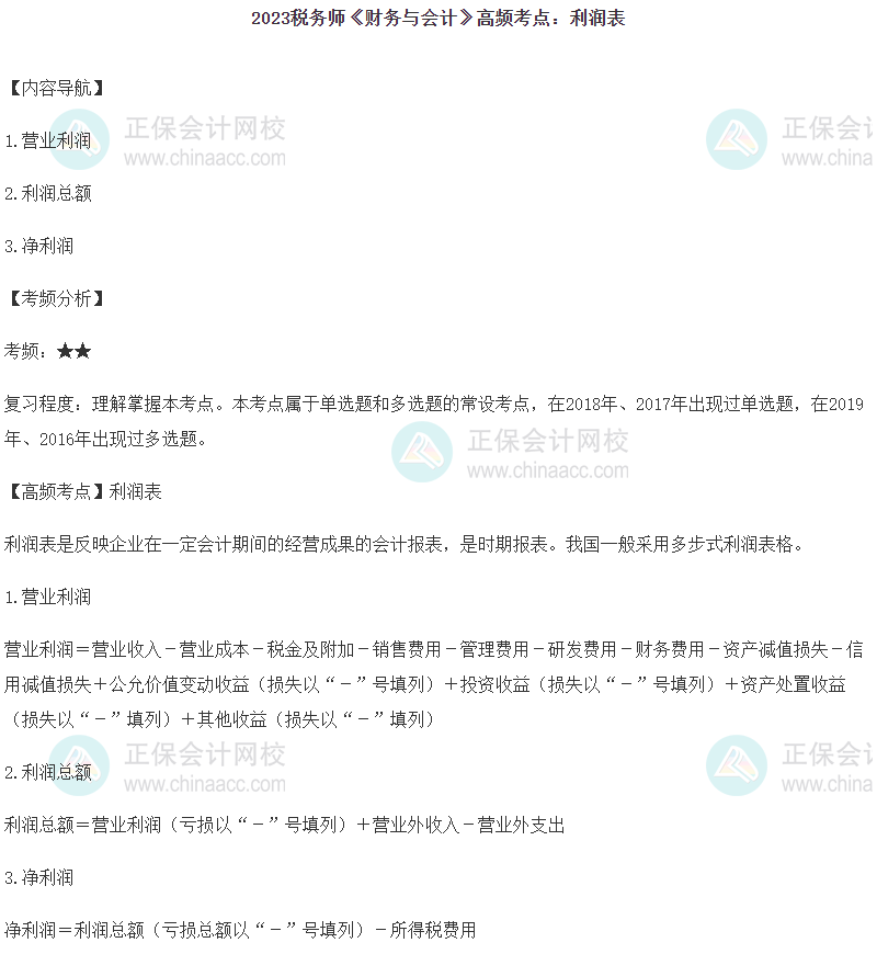 2023年税务师备考正在进行中,网校为各位考生整理了2023年税务师考试《财务与会计》第十八章的高频考点——利润表,正在复习的同学快来查收!
