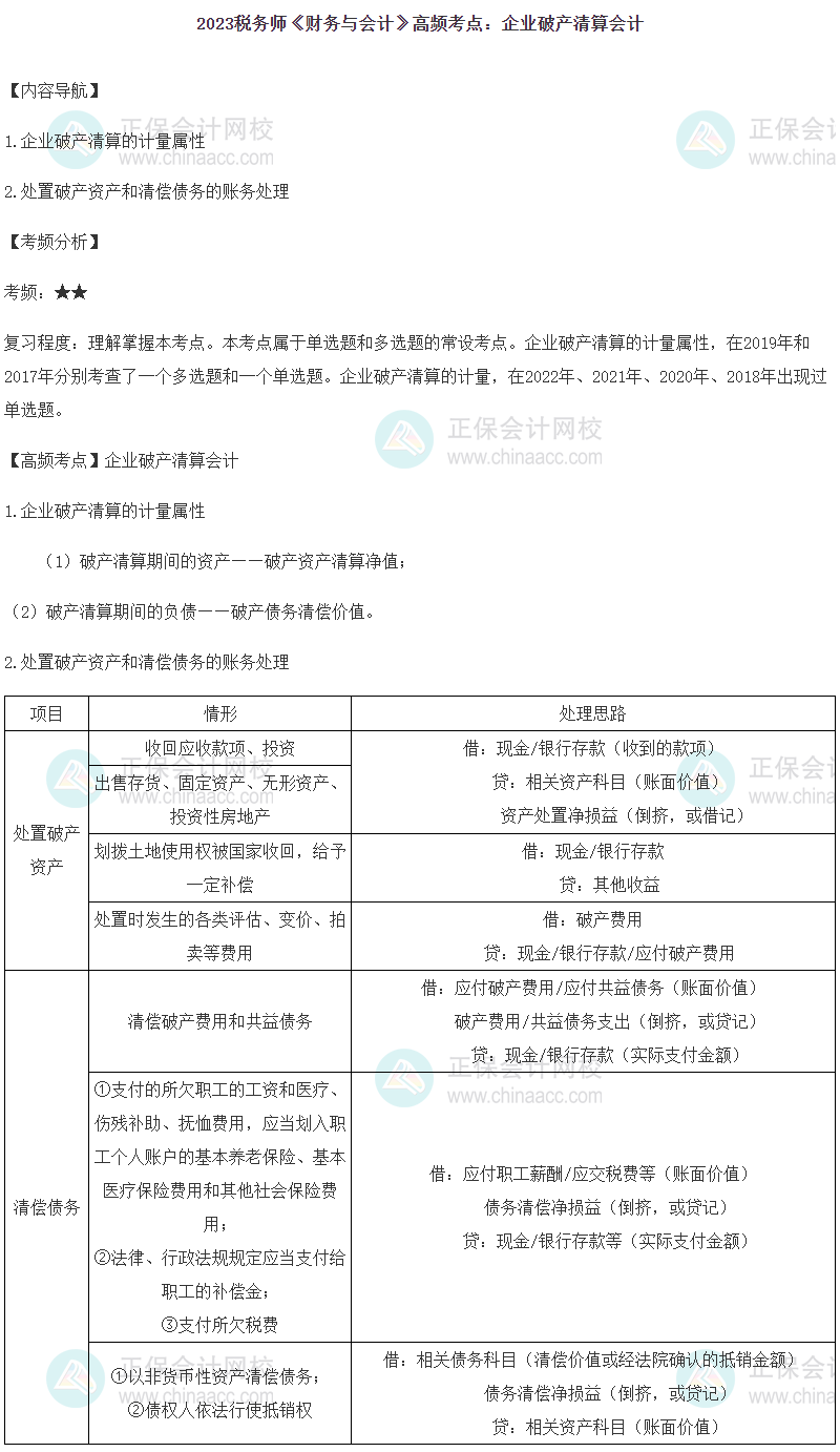 2023年税务师备考正在进行中,网校为各位考生整理了2023年税务师考试《财务与会计》第十九章的高频考点——企业破产清算会计,正在复习的同学快来查收!