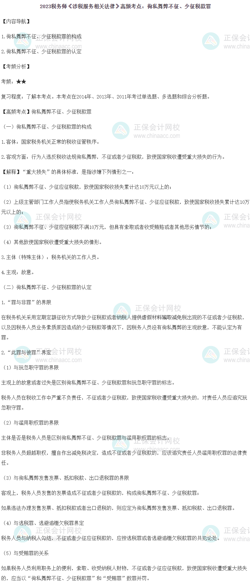 2023年税务师备考正在进行中,网校为各位考生整理了2023年税务师考试《涉税服务相关法律》第十八章的高频考点——徇私舞弊不征、少征税款罪,正在复习的同学快来查收!