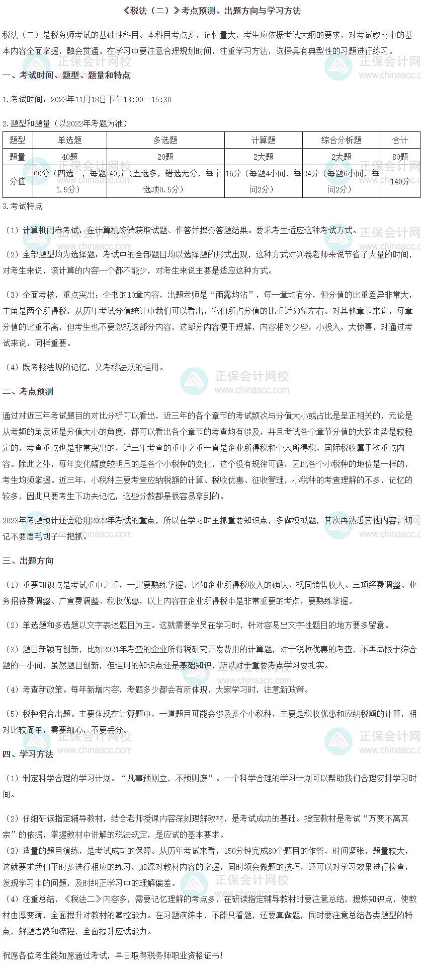 2023年税务师考试临近,大家都复习的如何?除了踏实备考,考试的考点、出题的方向同学们也要知晓。网校整理了2023税务师考试《税法二》科目的考点预测、出题方向与学习方法,快来看看吧!