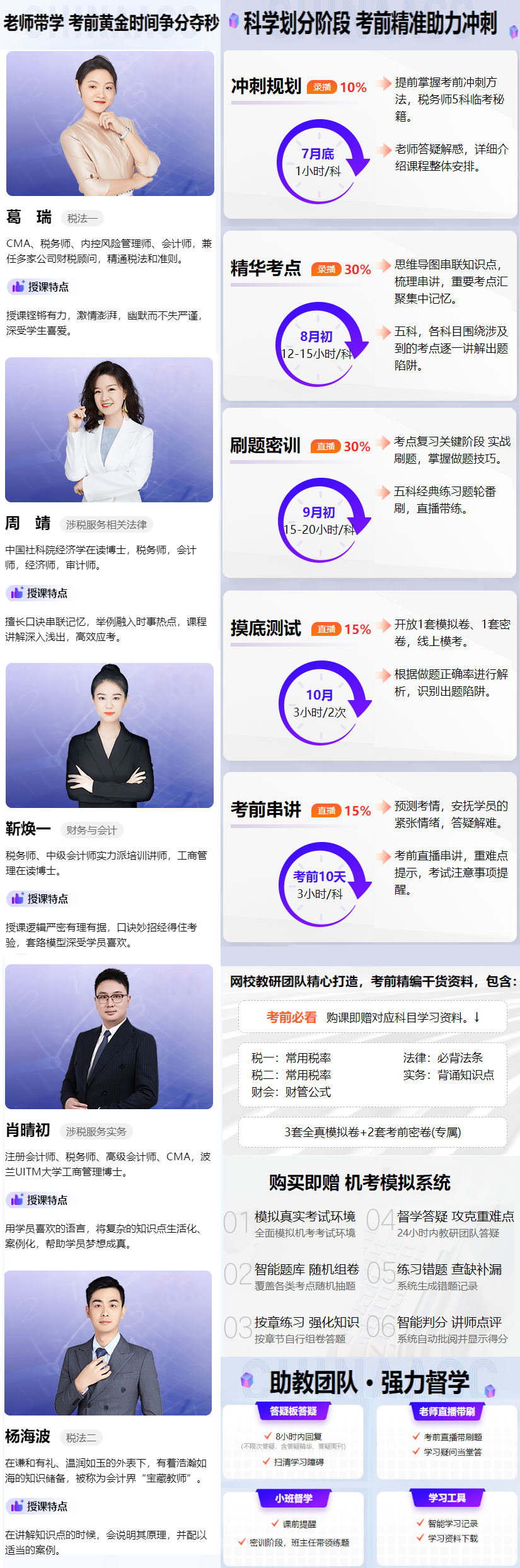 2023税务师考前刷题密训班上课中!老师带学,帮你争分夺秒,不浪费任何可利用的时间,阶段性备考逐步前推复习进度。还有助教团队督学护航,全程省心备考。