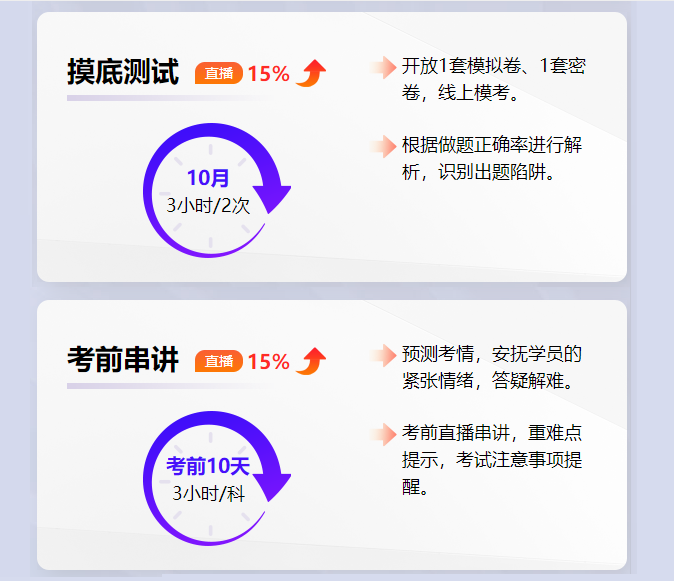 跟着密训班学习,考前还能在提升!每个阶段都精准对应复习进度,考前开启摸底测试和考前串讲,进一步推进备考!