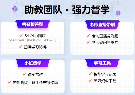 除了经验丰富的主讲老师,还有专业的助教团队督学护航!助教团队让你省心备考,你只管学习,剩下的交给我们,一定帮你打理好“后勤工作”!